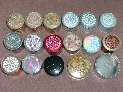 I have mentioned this before, I have this very expensive hobby of collecting Guerlain Meteorites (and pretty much everything Guerlain, come to think of it! :)). At most recent count I have 17 Meteorites powders, in fact I have all the Meteorites released by Guerlain since they changed the packaging from the big plastic containers to the smaller cardboard ones. (I don't know when that was, sometime around 2000 I think?) I also have one of their old style ones (Dorees - all gold powder balls). Here are a few photos of my Meteorites collection.