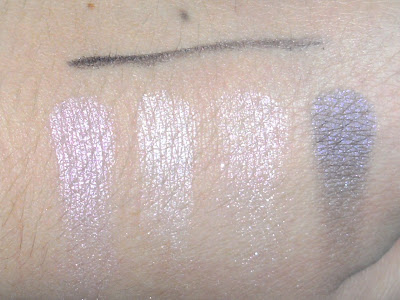 Bottom: Pink all over colour, cream base colour, pink highlighter, purple crease colour